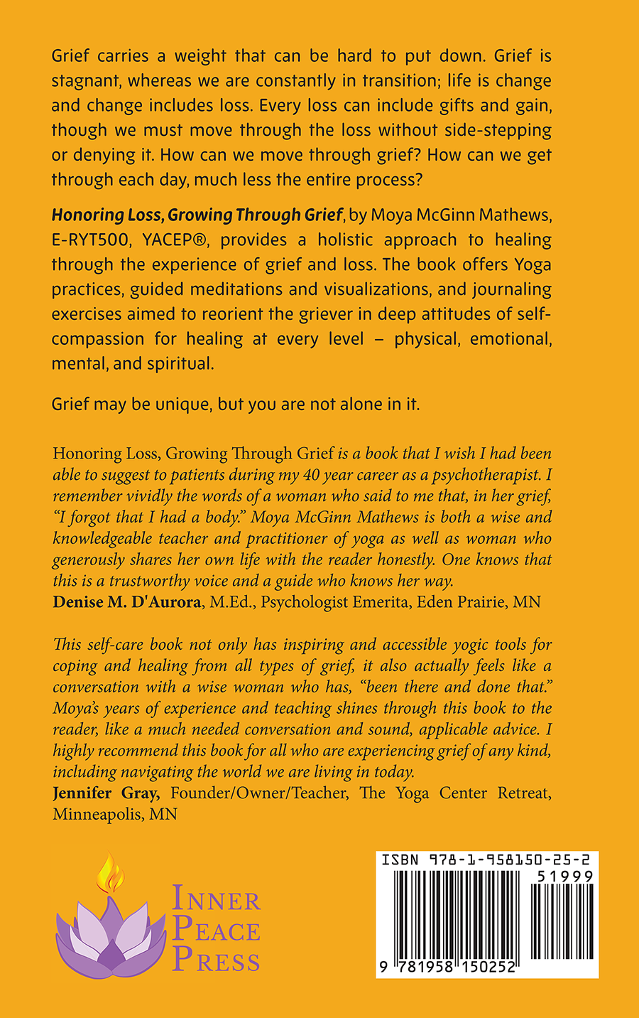 Honoring Loss, Growing Through Grief, by Registered Yoga Teacher, Moya McGinn Mathews, provides a holistic approach to healing through the experience of grief and loss. The book offers Yoga practices, guided meditations and visualizations, and journaling exercises aimed to reorient the griever in deep attitudes of self-compassion for healing at every level – physical, emotional, mental, and spiritual.